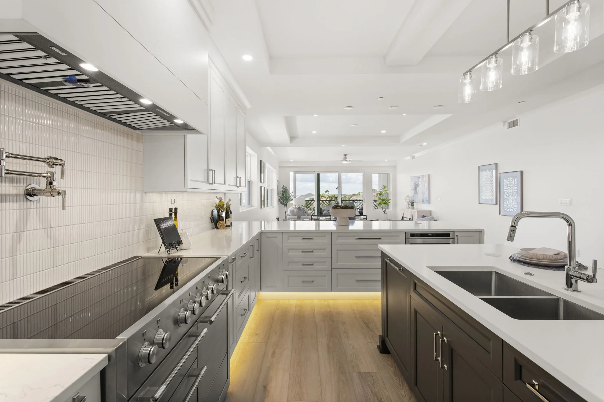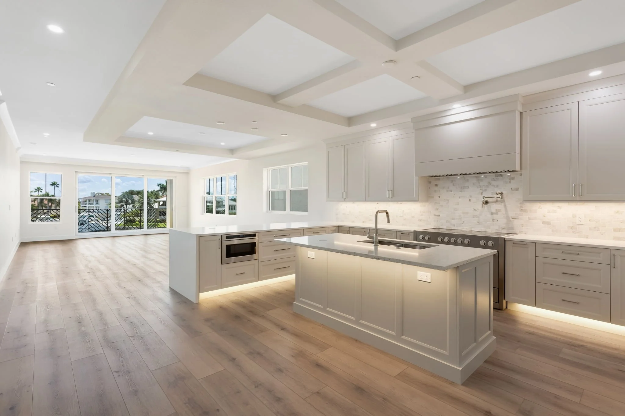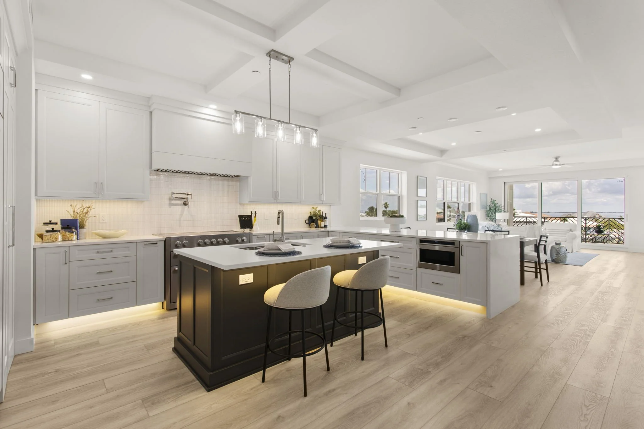 Inside, you’re greeted by driftwood-style flooring, shaker cabinetry, and under-cabinet lighting that set the tone for a light and breezy coastal aesthetic. The gourmet kitchen is a true showpiece—featuring gleaming quartz countertops, herringbone tile backsplash, an oversized prep island, hidden walk-in pantry, and top-of-the-line appliances—all designed with both form and function in mind.