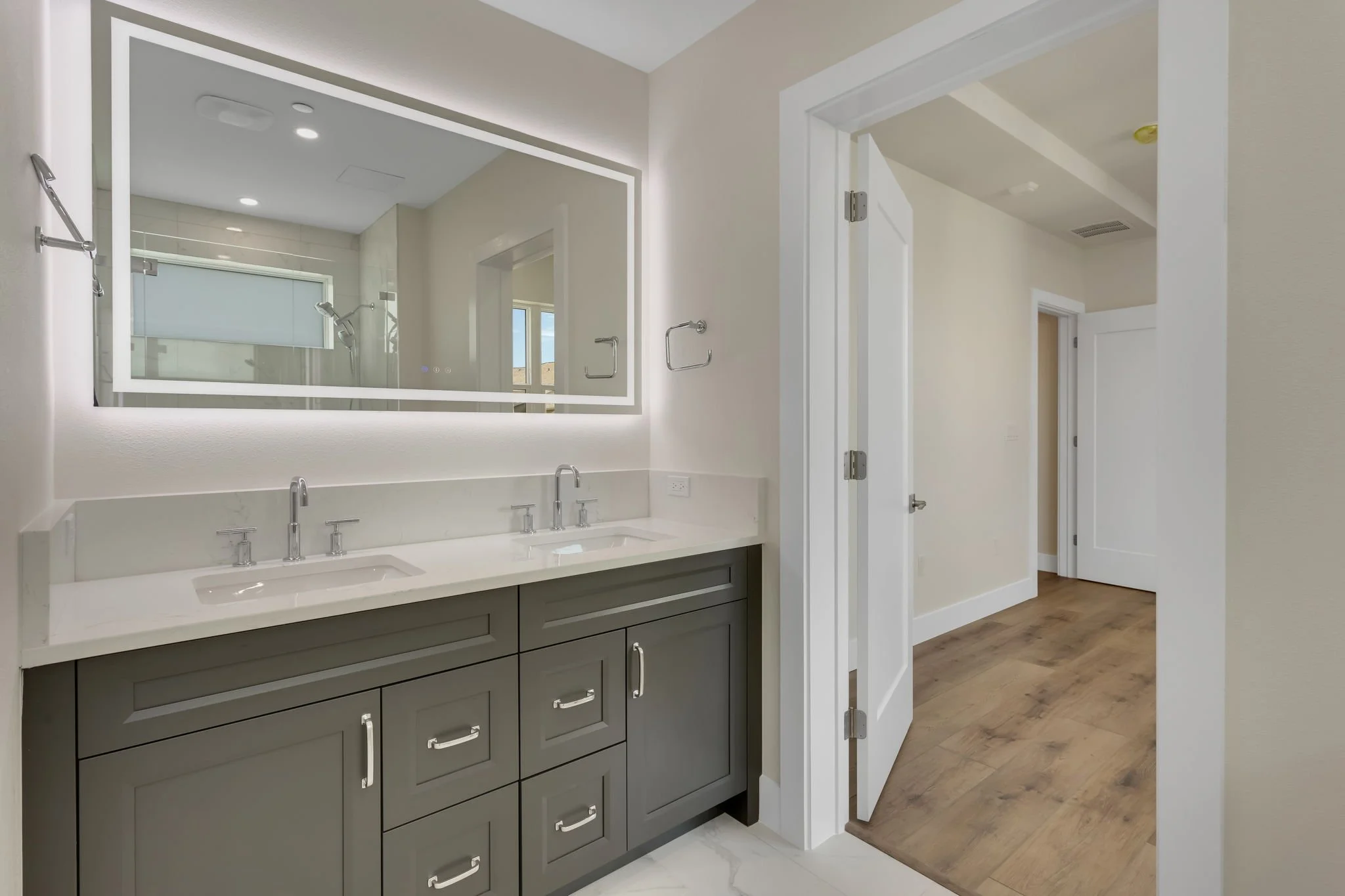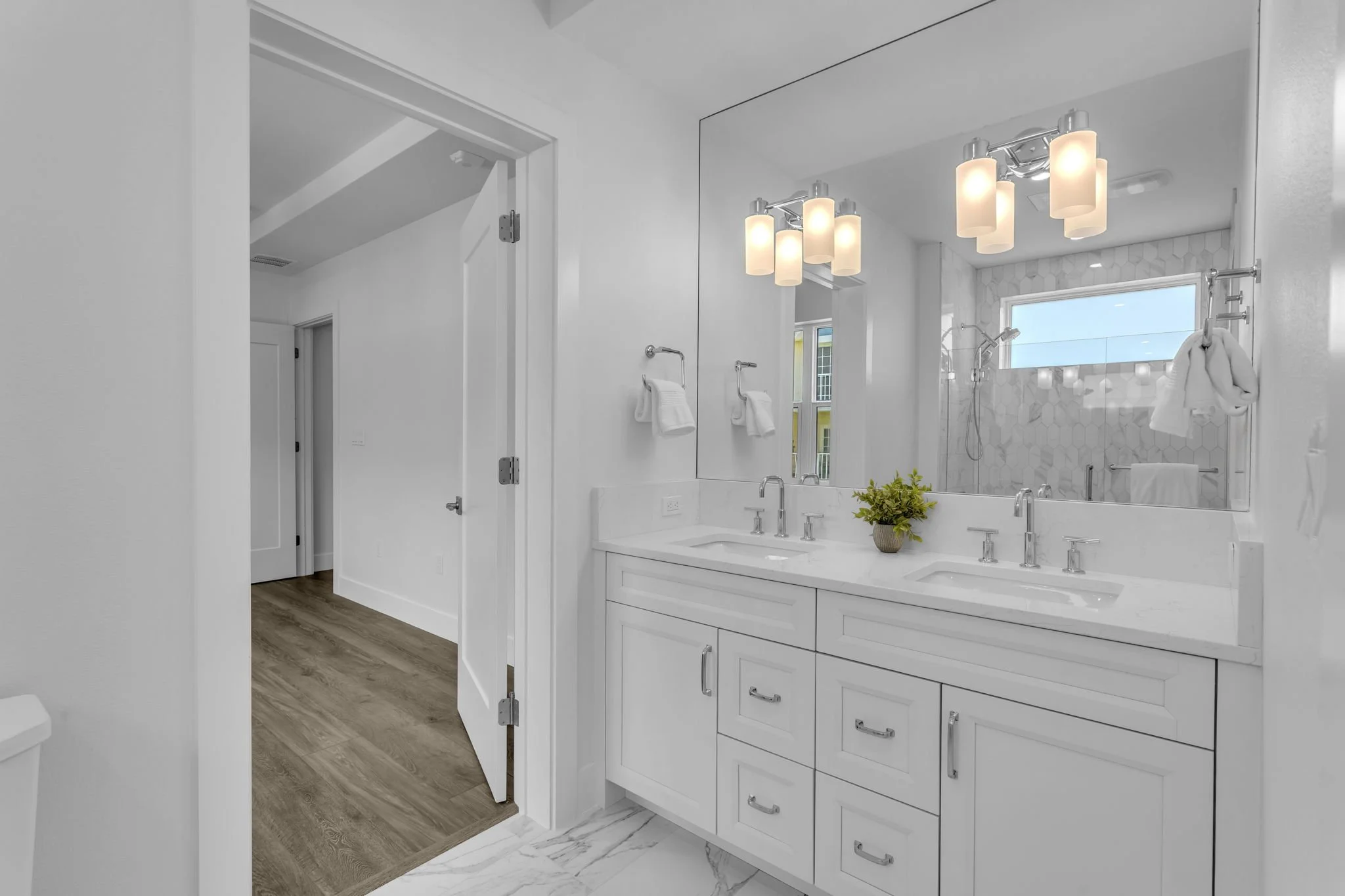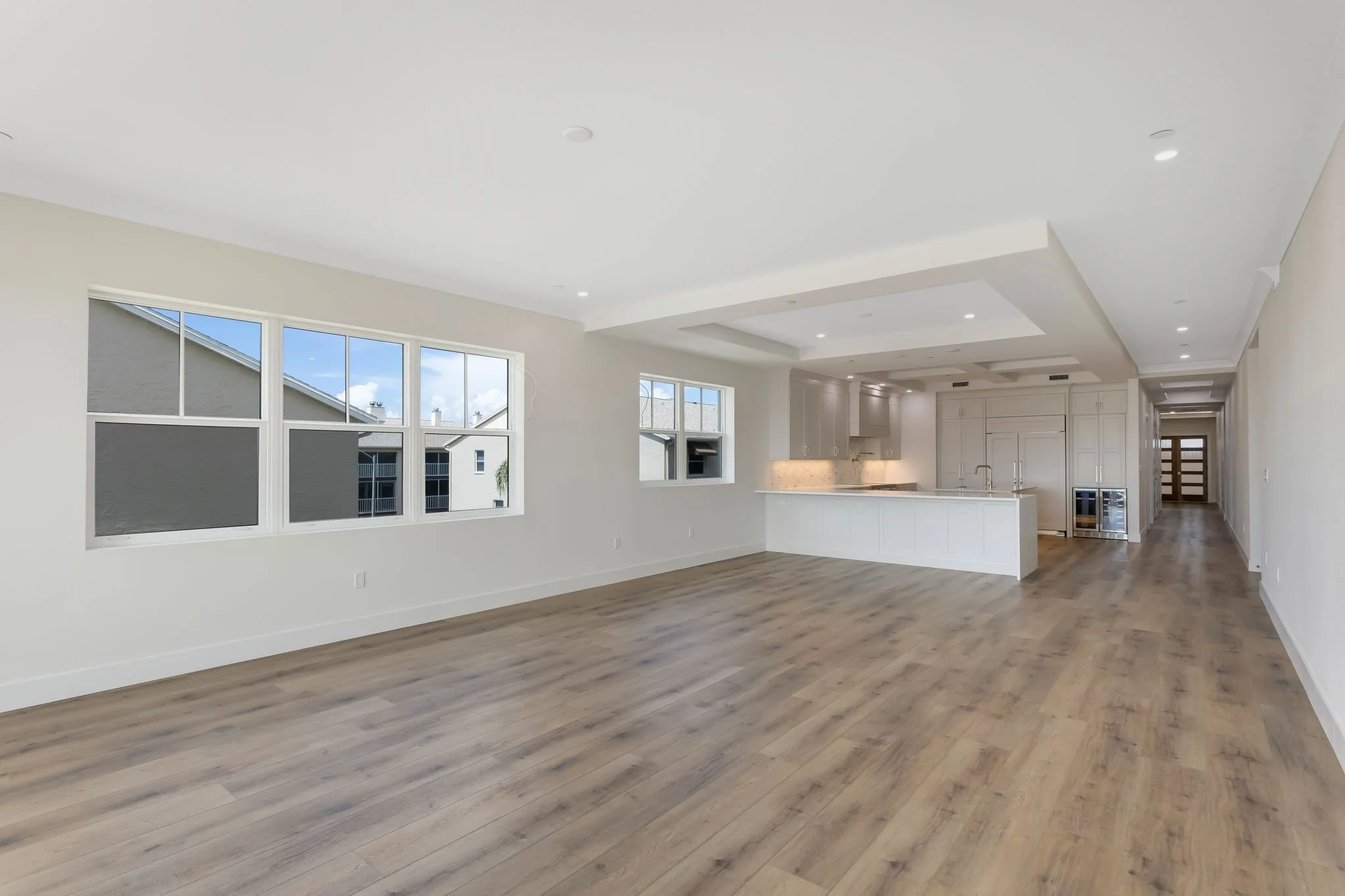 Inside, you’re greeted by driftwood-style flooring, shaker cabinetry, and under-cabinet lighting that set the tone for a light and breezy coastal aesthetic. The gourmet kitchen is a true showpiece—featuring gleaming quartz countertops, herringbone tile backsplash, an oversized prep island, hidden walk-in pantry, and top-of-the-line appliances—all designed with both form and function in mind.