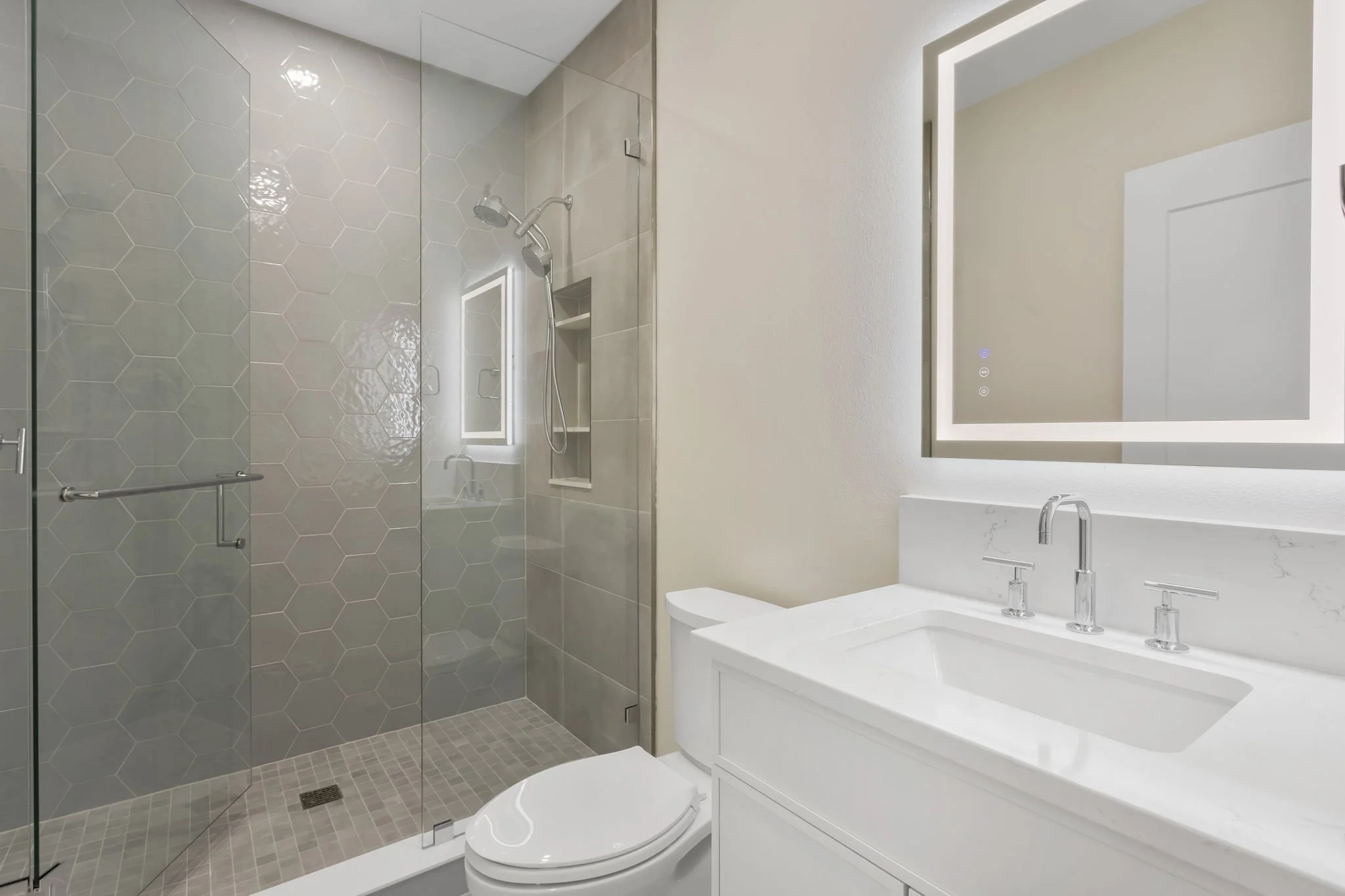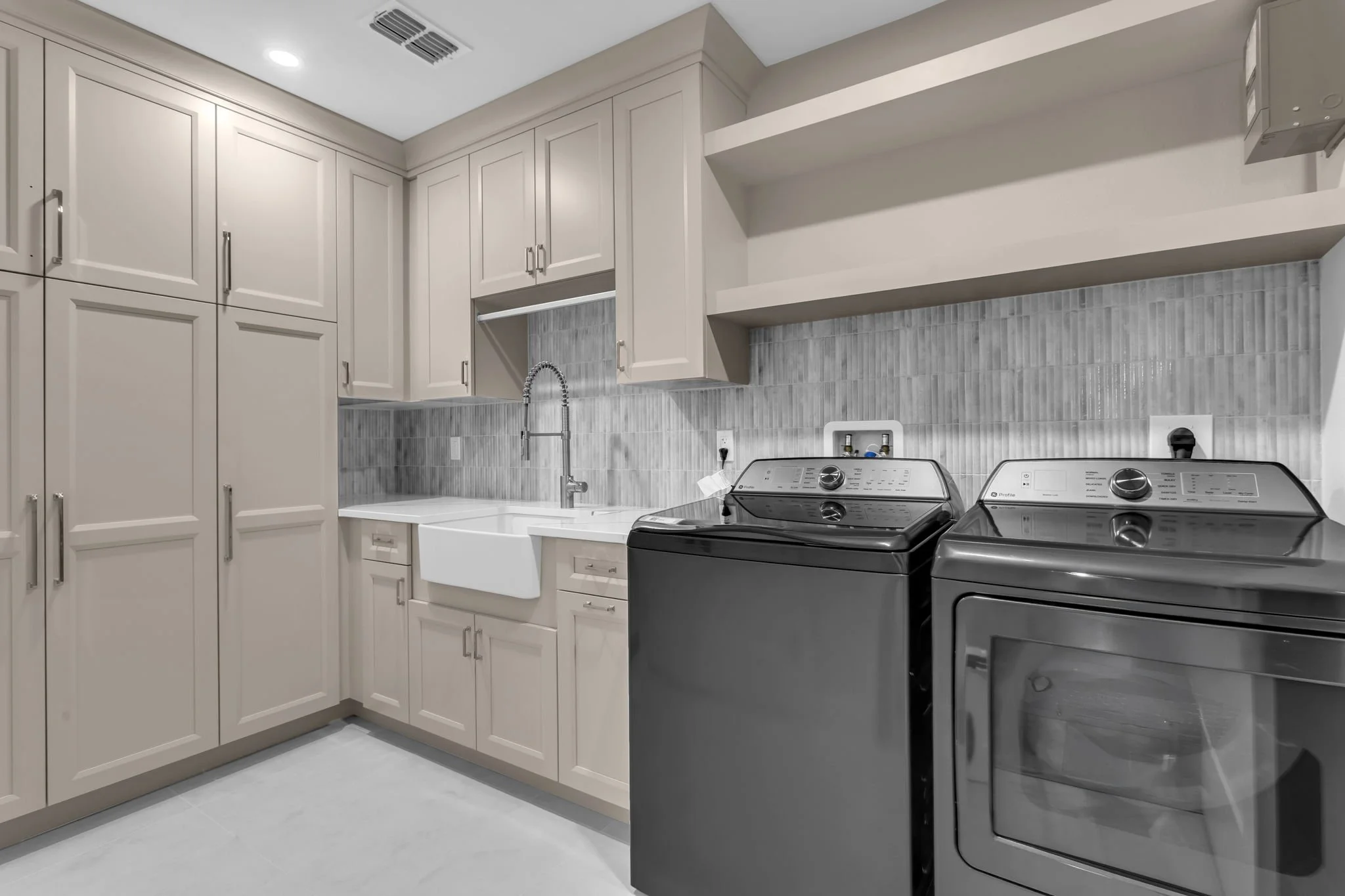 The laundry room is equally impressive, offering quartz countertops, extensive cabinetry, premium tilework, and a porcelain farmhouse sink.