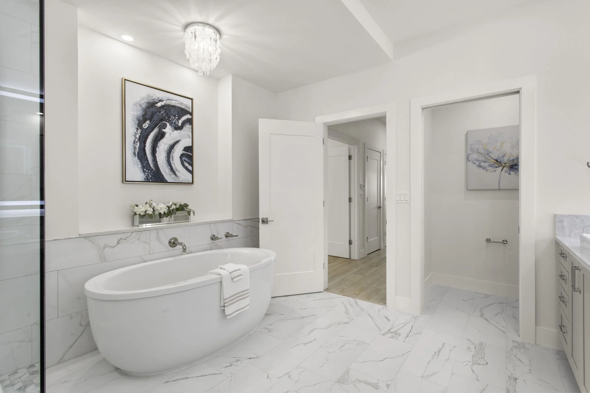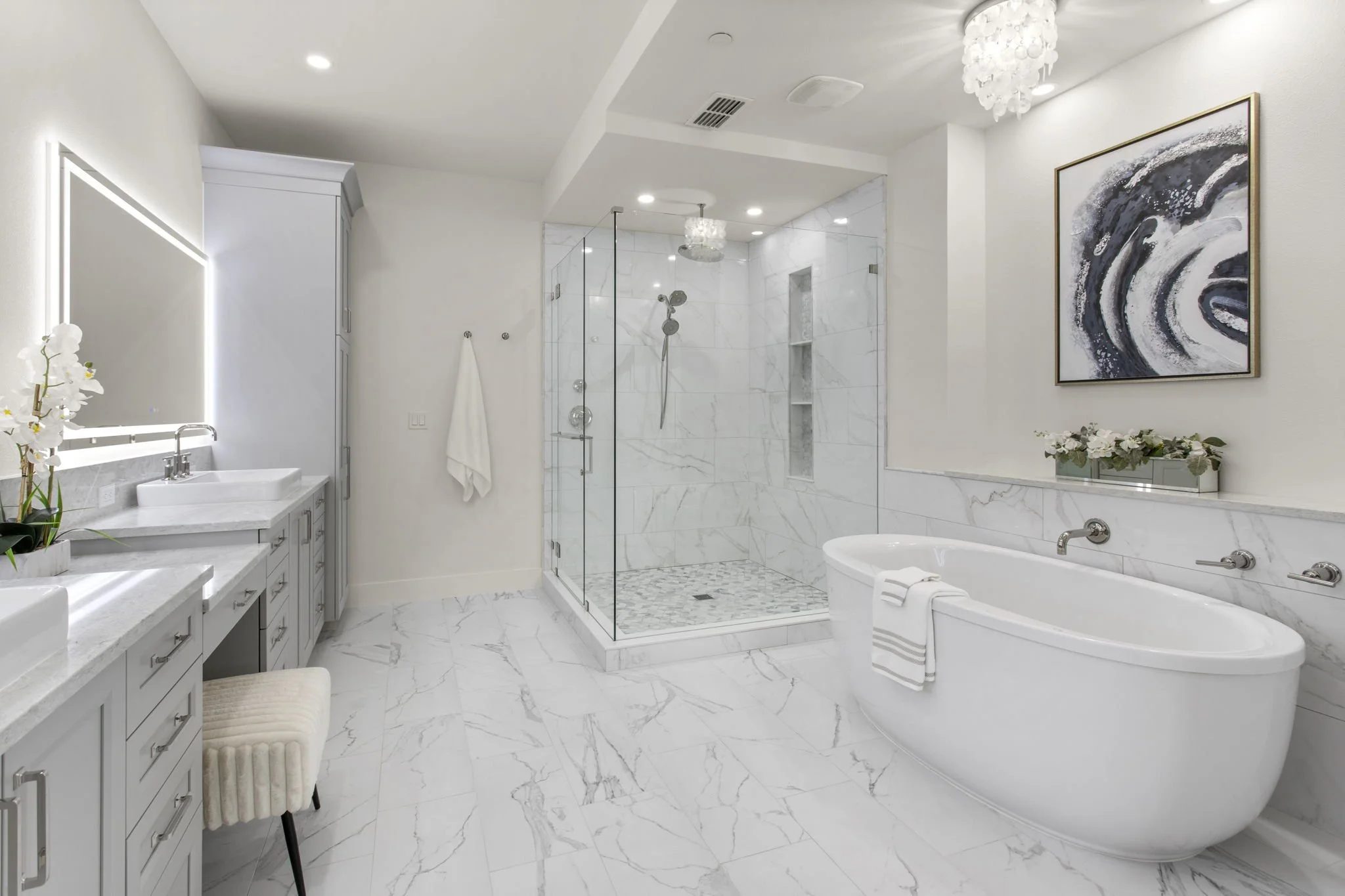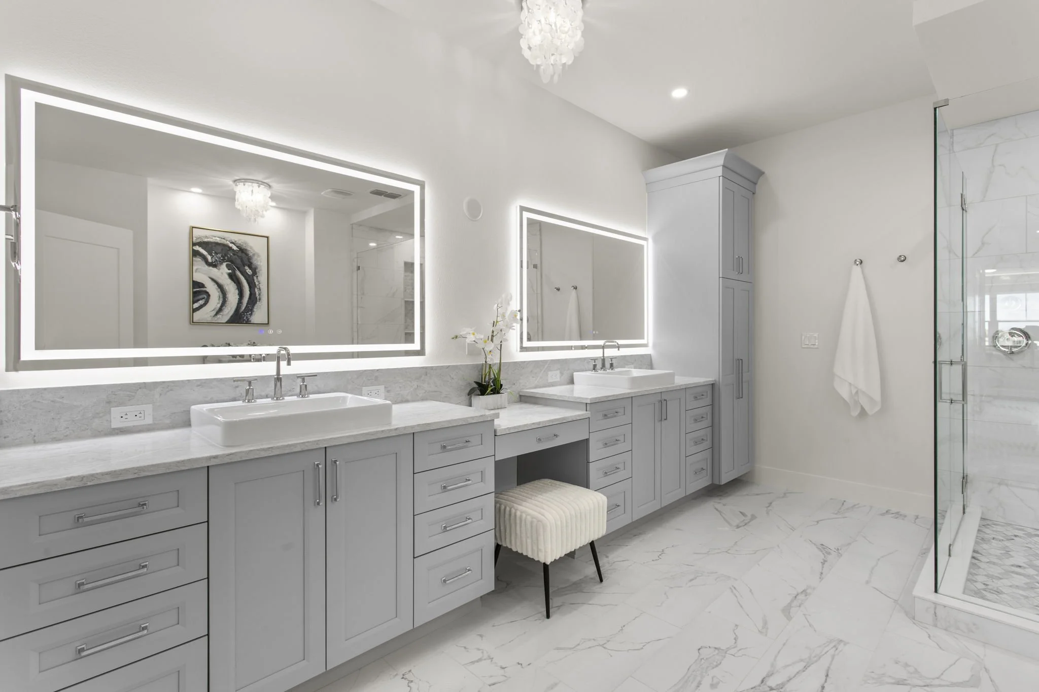 The owner’s suite is a private retreat, complete with a waterfront sitting area, dual walk-in closets, and a spa-style en suite bath with double vanities, a dedicated makeup station, standalone soaking tub, and a glass-enclosed multi-head rain shower adorned in elegant tile.