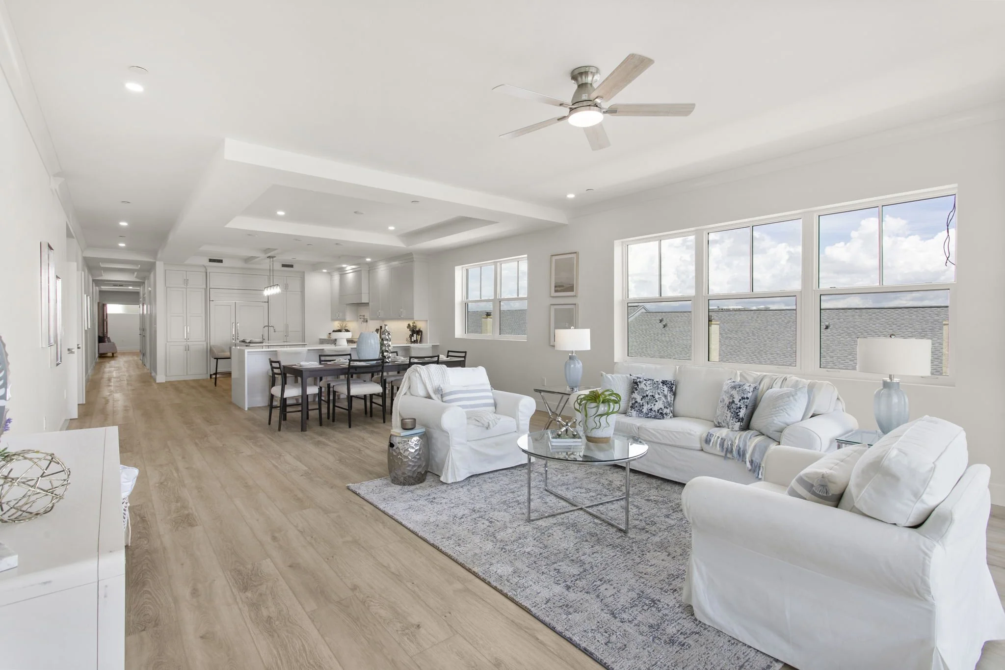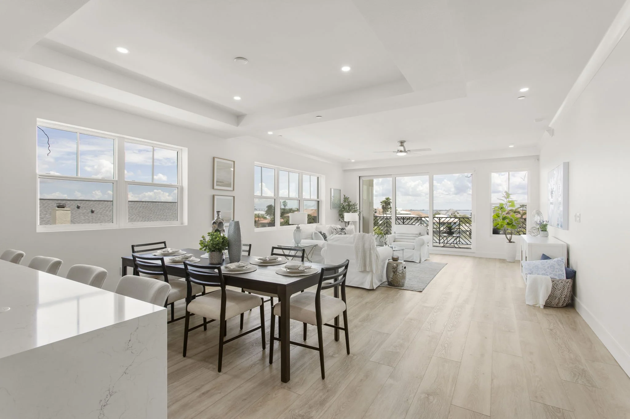 The spacious great room flows seamlessly between dining and living spaces and opens to a deep covered balcony with waterfront views overlooking the pool, ideal for indoor-outdoor entertaining. Remote-controlled window treatments add effortless comfort.